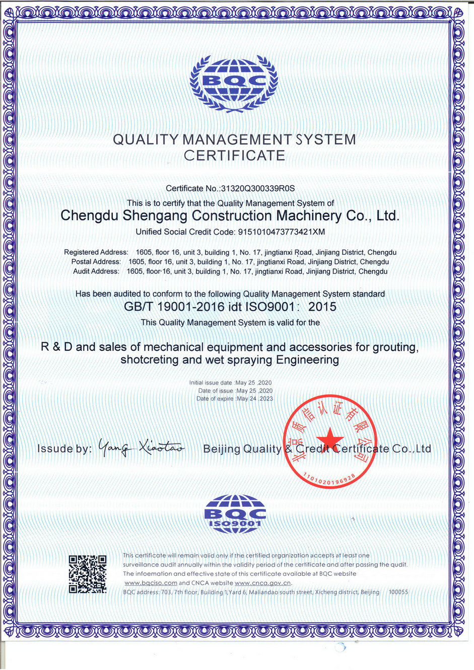 經(jīng)過(guò)國(guó)家權(quán)威機(jī)構(gòu)質(zhì)量認(rèn)證中心專家組的全面、嚴(yán)格、細(xì)致的指導(dǎo)和審核,確認(rèn)成都申港工程機(jī)械有限公司質(zhì)量管理體系符合GB/T19001-2016 idt ISO9001:2015標(biāo)準(zhǔn),并于2020年5月25日向我公司正式頒發(fā)了ISO9001質(zhì)量管理體系認(rèn)證。