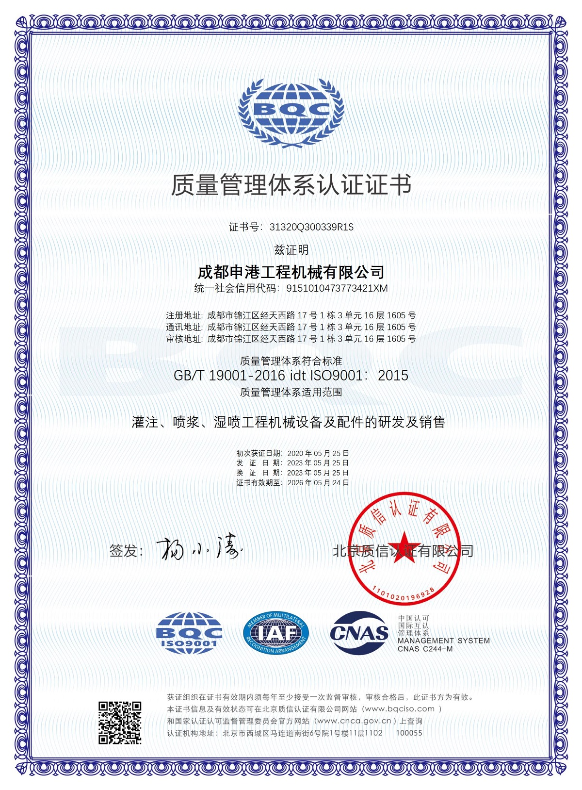 5月25日,成都申港工程機械有限公司完成《質量管理體系認證證書》換證工作,標志著成都申港公司質量管理體系工作再次得到中國質量認證中心關于ISO9001質量管理體系的認證和審核。