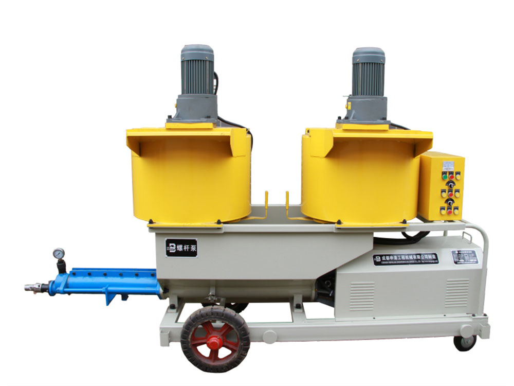 本機由攪拌機構、增壓輸送機構和電氣系統(tǒng)組成。增壓輸送機構由電動機、減速器、輸送螺旋、增壓定子總成、測壓接頭、注漿管等組成。其特點如下: